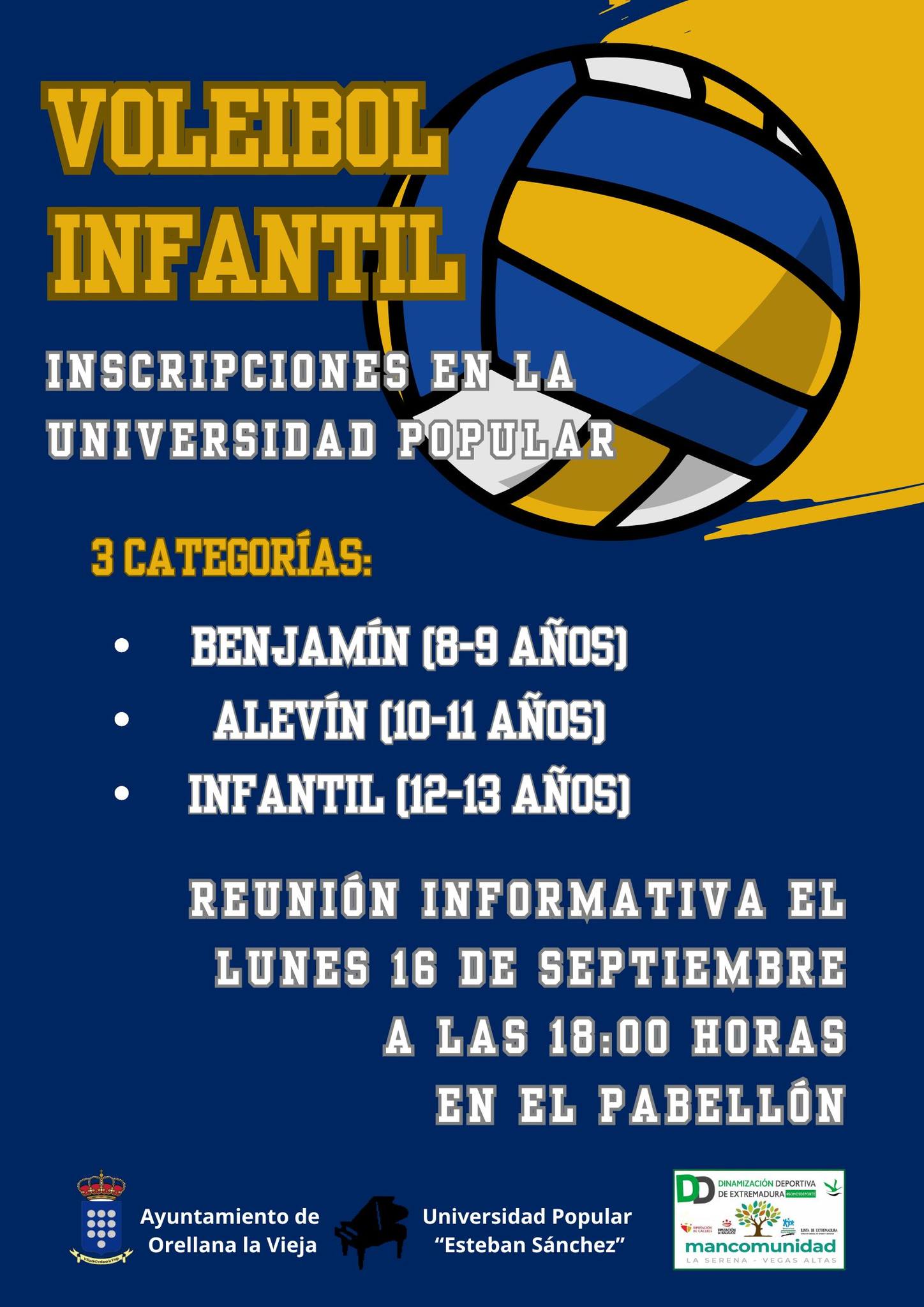 Diez días antes de esa fecha, el 16 de septiembre, a las 18:00 horas, habrá reunión informativa para el voleibol infantil, cuyo plazo de inscripciones ya está abierto. Habrá tres categorías: Benjamín (de 8 a 9 años), Alevín (de 10 a 11 años) e Infantil (de 12 a 13 años).