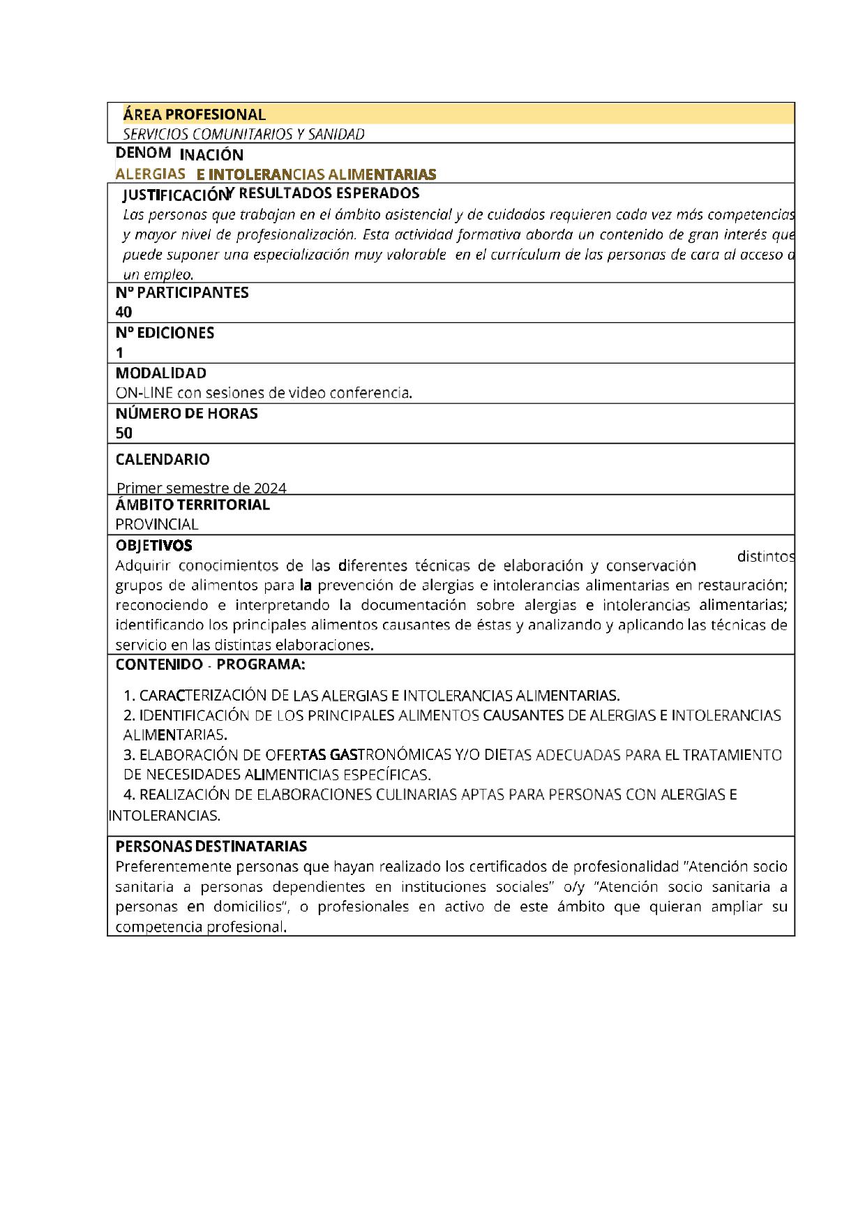 El otro curso, de Alergias e Intolerancias Alimentarias, va destinado preferentemente a personas que hayan realizado los certificados de profesionalidad de “Atención sociosanitaria a personas dependientes en instituciones sociales” o/y “Atención socio sanitaria a Personas en domicilios”, o profesionales en activo de este ámbito que quieran ampliar su competencia profesional.
