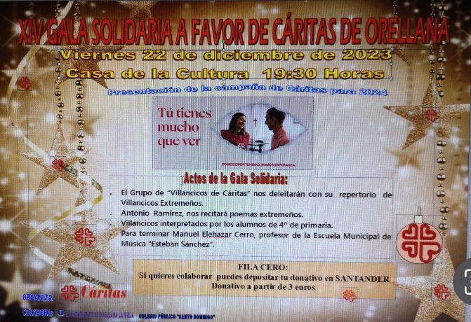 Un año más, vuelve a la Casa de la Cultura la Gala Solidaria de Cáritas, que este año tendrá actuaciones musicales por parte del Grupo de Villancicos de Cáritas y recitales de poemas extremeños por parte de Antonio Ramírez, así como villancicos por parte de los alumnos de cuarto de primaria y la actuación del profesor de la Escuela de Música de Orellana la Vieja, Manuel Elehazar.