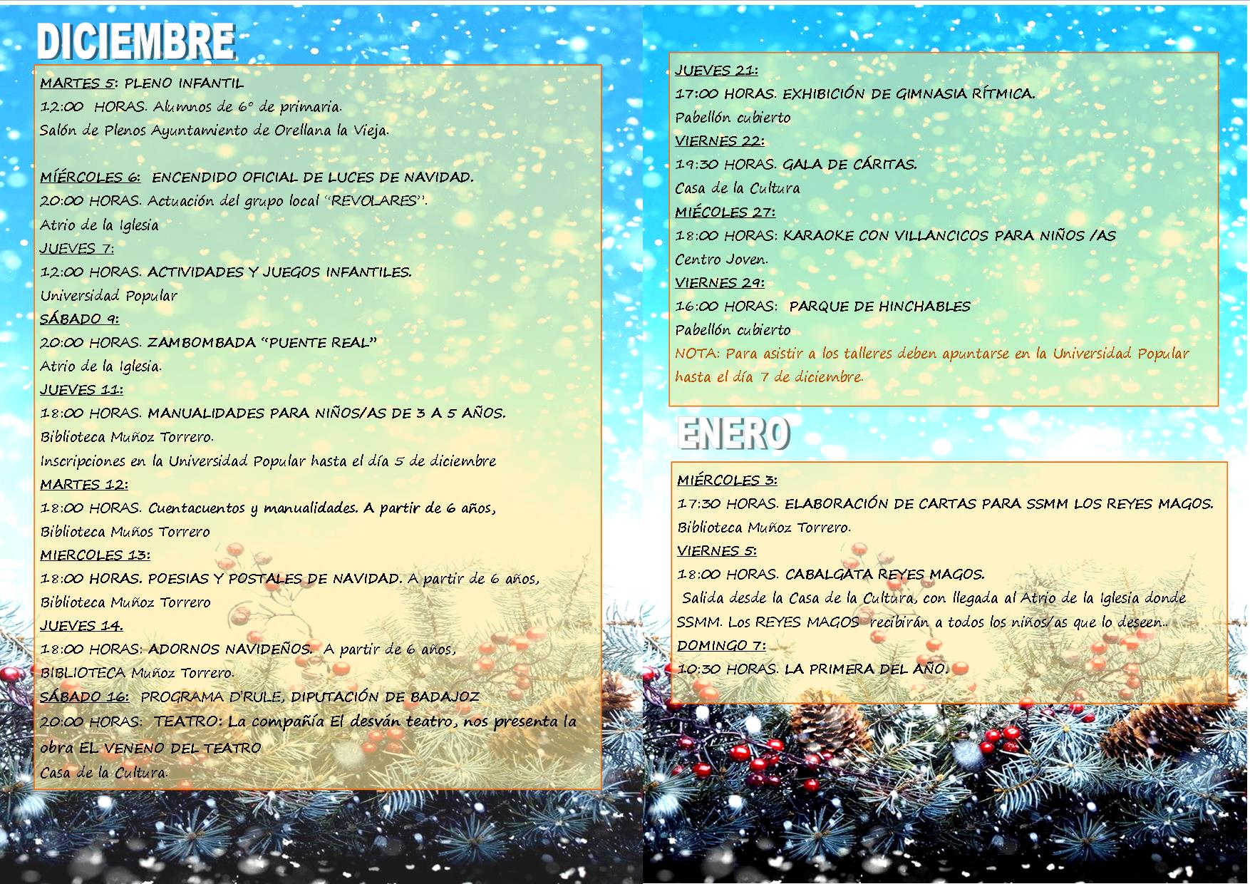 De igual forma, durante todo el próximo mes, habrá actividades y talleres para niños y adolescentes en la Biblioteca Muñoz Torrero, además de una obra de teatro el próximo 16 de diciembre, una exhibición de gimnasia rítmica y un parque de hinchables en el Pabellón Deportivo, la habitual Gala de Cáritas, un karaoke con Villancicos en el Centro Joven y la Cabalgata de Reyes Magos. El programa finalizará el 7 de enero, con la vuelta de una de las pruebas deportivas más entrañables, La Primera del Año, una carrera de carácter lúdico y deportivo que organiza Orellana Runners.