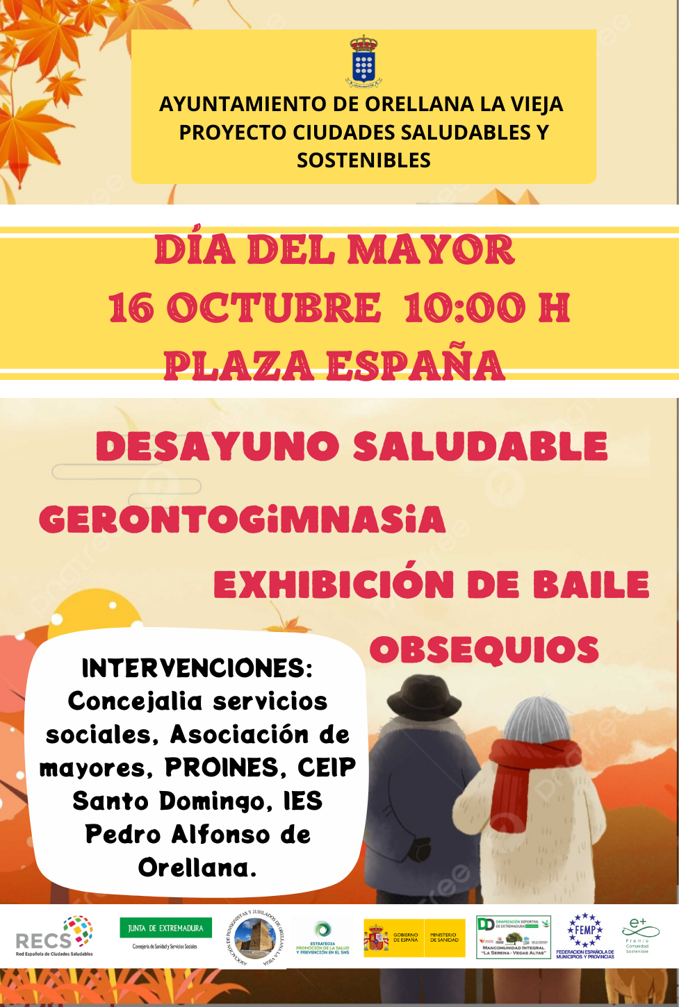 El acto contará con un desayuno saludable y una exhibición de gerontogimnasia. Además, el programa cuenta con exhibición de baile y regalo de obsequios, así como con las intervenciones de la concejalía de servicios sociales, la asociación de mayores, PROINES y los centros educativos orellanenses (CEIP Santo Domingo y el IES Pedro Alfonso de Orellana).