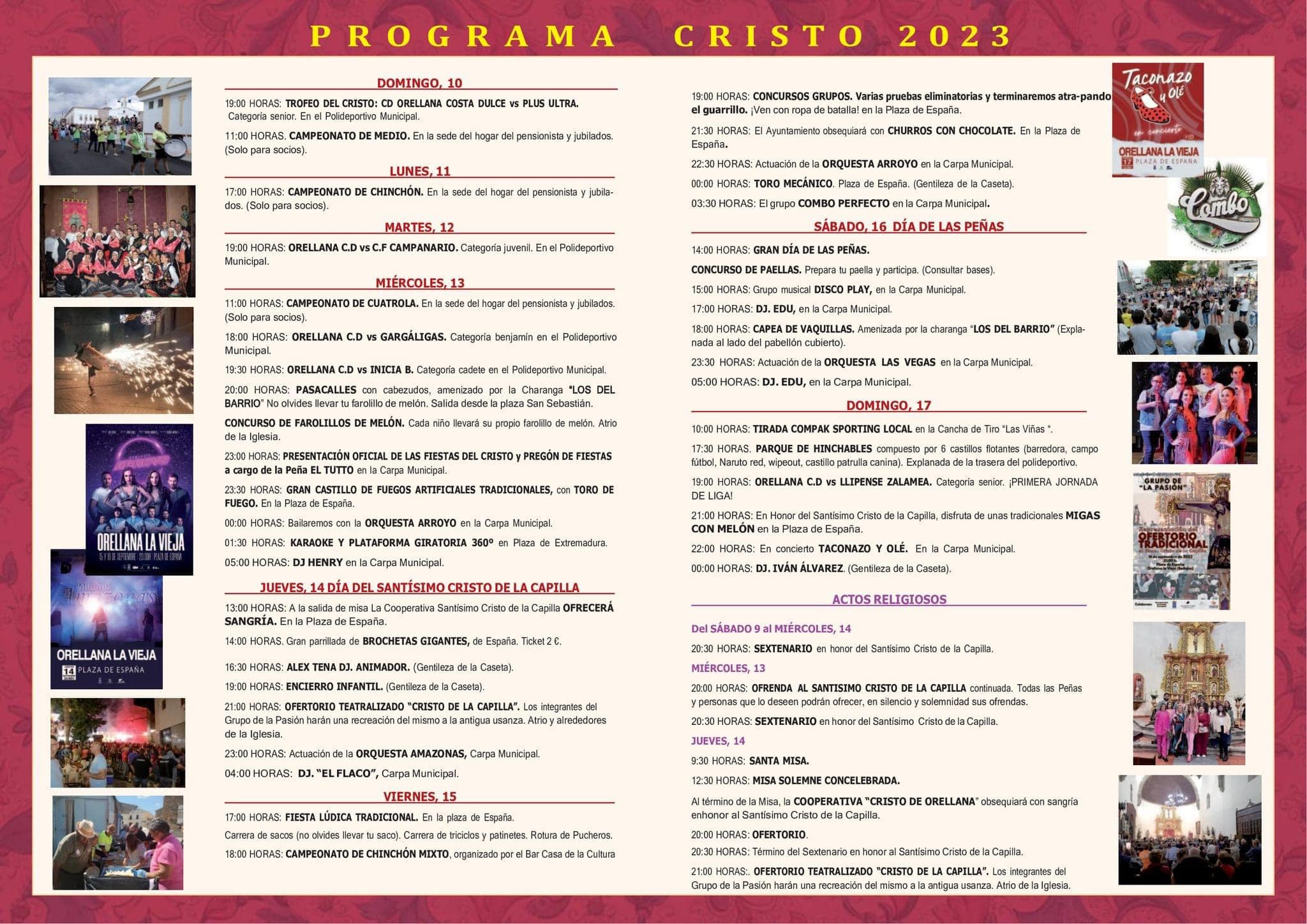 Hoy seguirán los actos con un campeonato de chinchón en el hogar del pensionista a partir de las 17:00 horas. Mañana habrá partido de los juveniles de Orellana contra los de Campanario, a partir de las 19:00 horas en el Polideportivo.